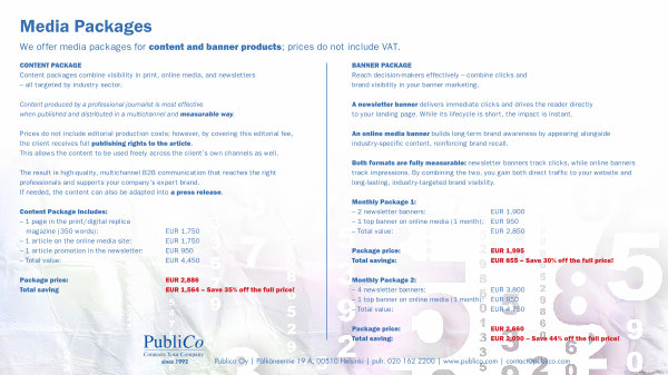 Monthly Package 1: – 2 newsletter banners: EUR 1,900 – 1 top banner on online media( 1 month): EUR 950 – Total value: EUR 2,850
